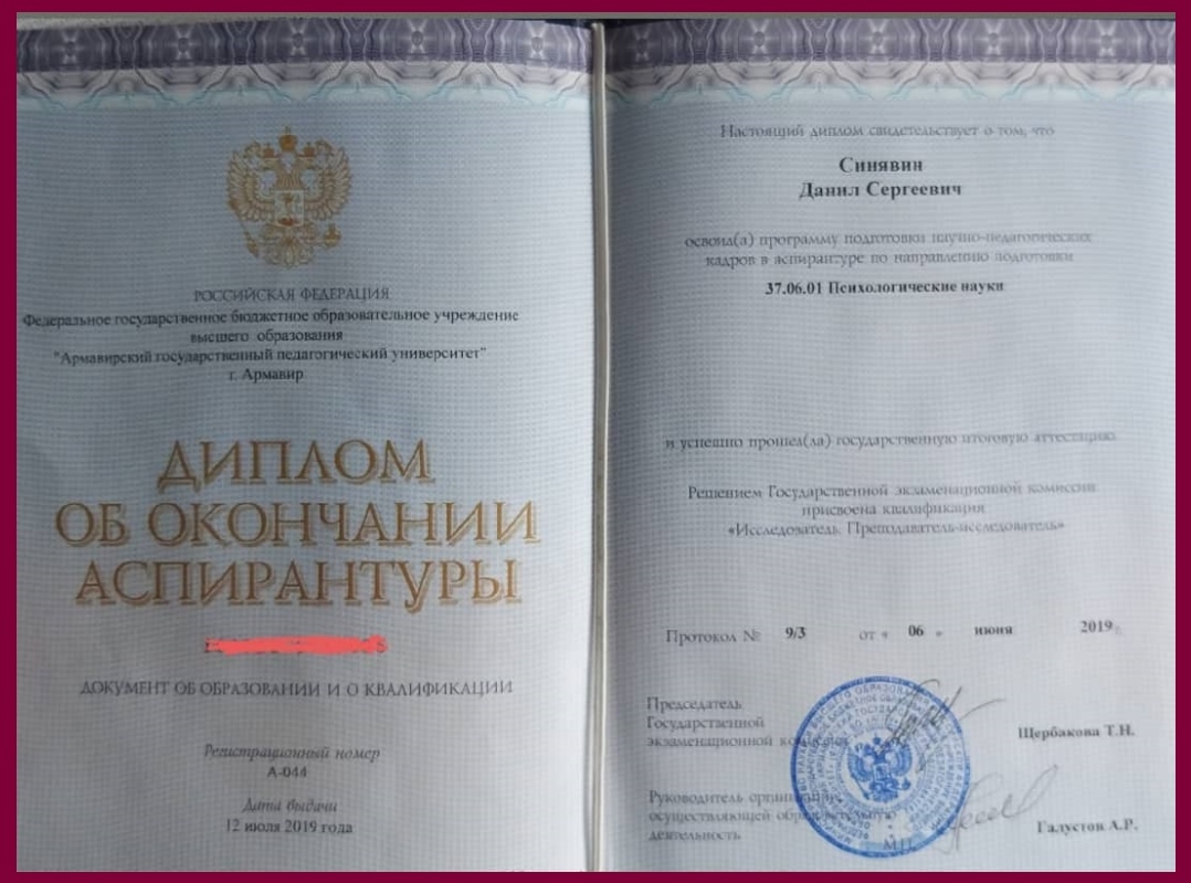 Диплом об окончании аспирантуры. 2019 год